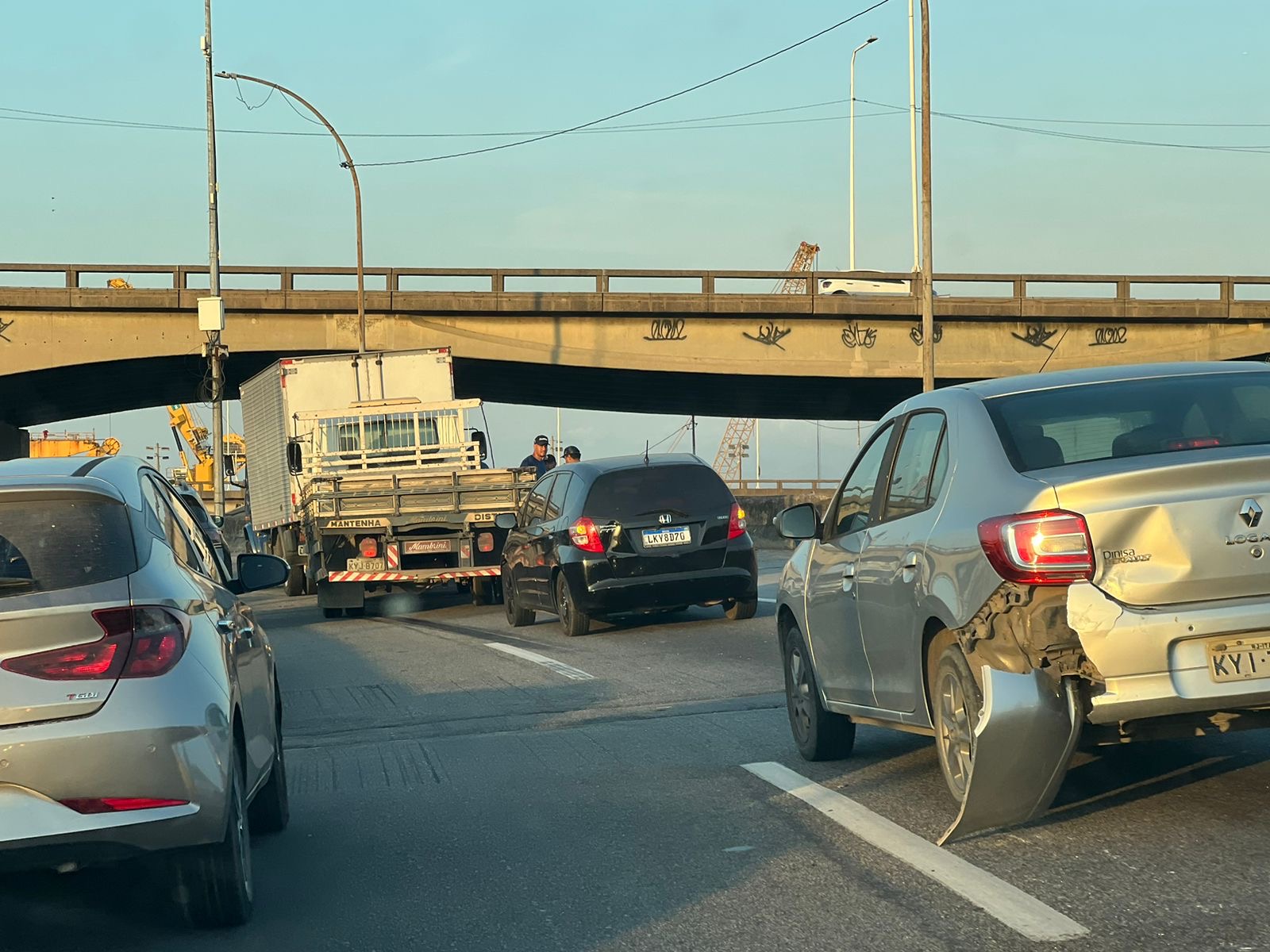 Um incidente envolvendo pelo menos uma motocicleta, dois veículos particulares e dois caminhões resultou em congestionamento na entrada da Ponte Rio-Niterói na tarde desta segunda-feira (27). O acidente aconteceu na alça de subida pela Avenida Brasil, no sentido Niterói, provocando retenções significativas no tráfego.