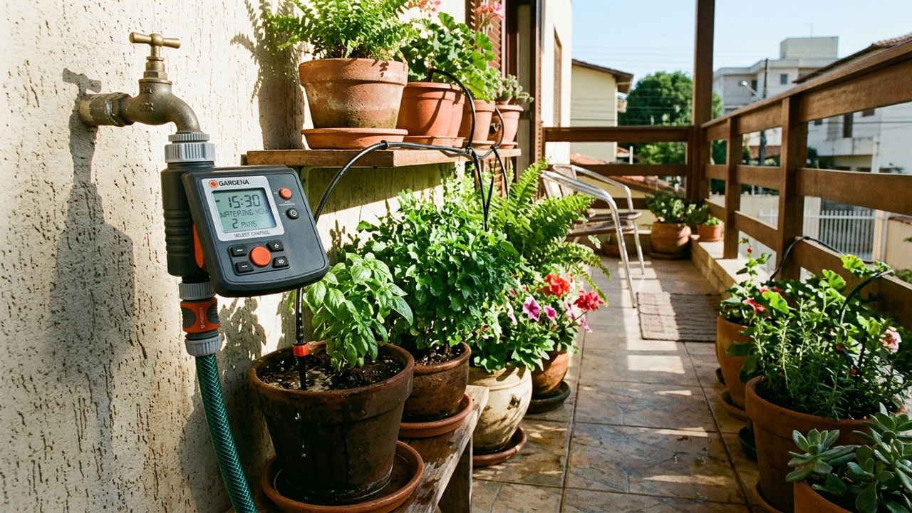 A instalação de um temporizador no sistema de irrigação da varanda automatiza o processo de cuidado com as plantas, garantindo a rega em horários predeterminados e reduzindo o desperdício de água. Essa tecnologia assegura que a irrigação seja realizada de forma eficiente, promovendo o crescimento saudável de vasos e jardins verticais.