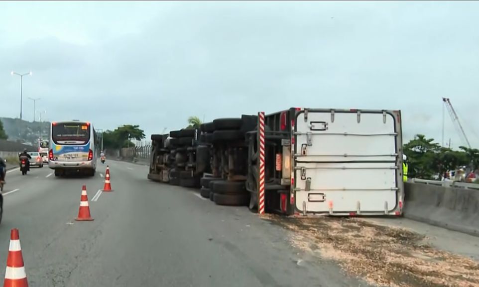Na madrugada desta terça-feira (28), um caminhão carregado com aproximadamente 14 toneladas de frutas tombou na Avenida do Contorno (BR-101), na altura do Barreto, em Niterói, sentido Ponte Rio-Niterói. Apesar do impacto, o condutor saiu do acidente sem ferimentos graves. O episódio gerou um congestionamento de cerca de 5 quilômetros, que atingiu até o bairro do Gradim, em São Gonçalo, por volta das 6h50.