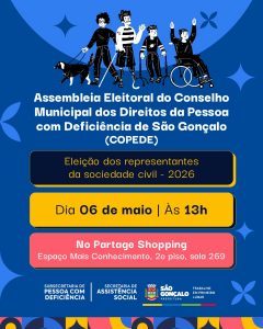 A Comissão Eleitoral do Conselho Municipal dos Direitos da Pessoa com Deficiência de São Gonçalo iniciou o processo de seleção dos membros da sociedade civil para o mandato de 2026 a 2028. O procedimento inclui a convocação de entidades, pessoas com deficiência e demais cidadãos envolvidos na temática, para participarem da assembleia de eleição.