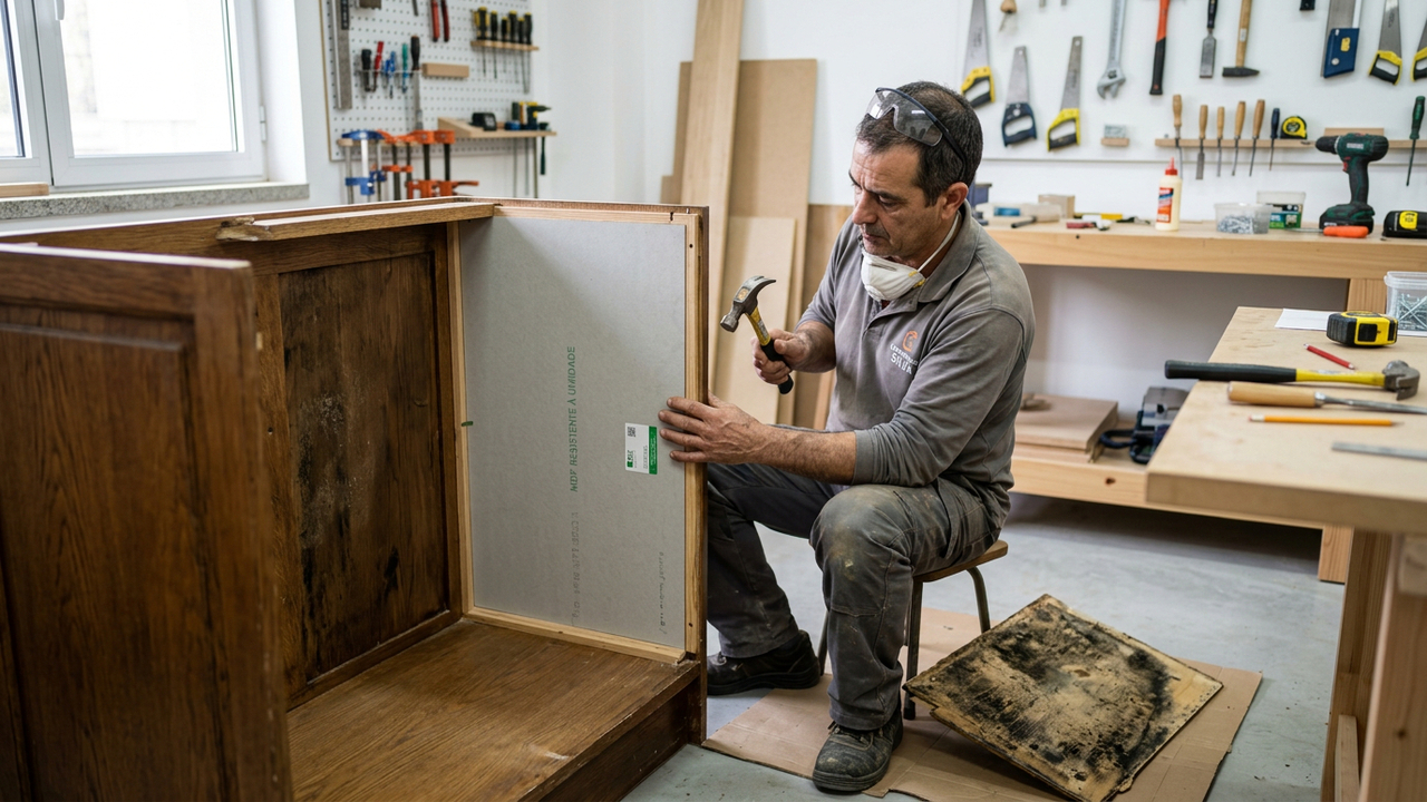 O procedimento de troca começa pela remoção da chapa mofada, a fim de evitar a contaminação de outras partes do móvel. Antes de fixar o novo material, o marceneiro realiza uma higienização completa da estrutura interna. Técnicas apropriadas incluem a limpeza com produtos fungicidas, a aplicação de selador nas bordas do novo painel, o uso de distanciadores plásticos para evitar contato com paredes úmidas e uma fixação firme com grampos de aço, garantindo maior estabilidade ao armário.