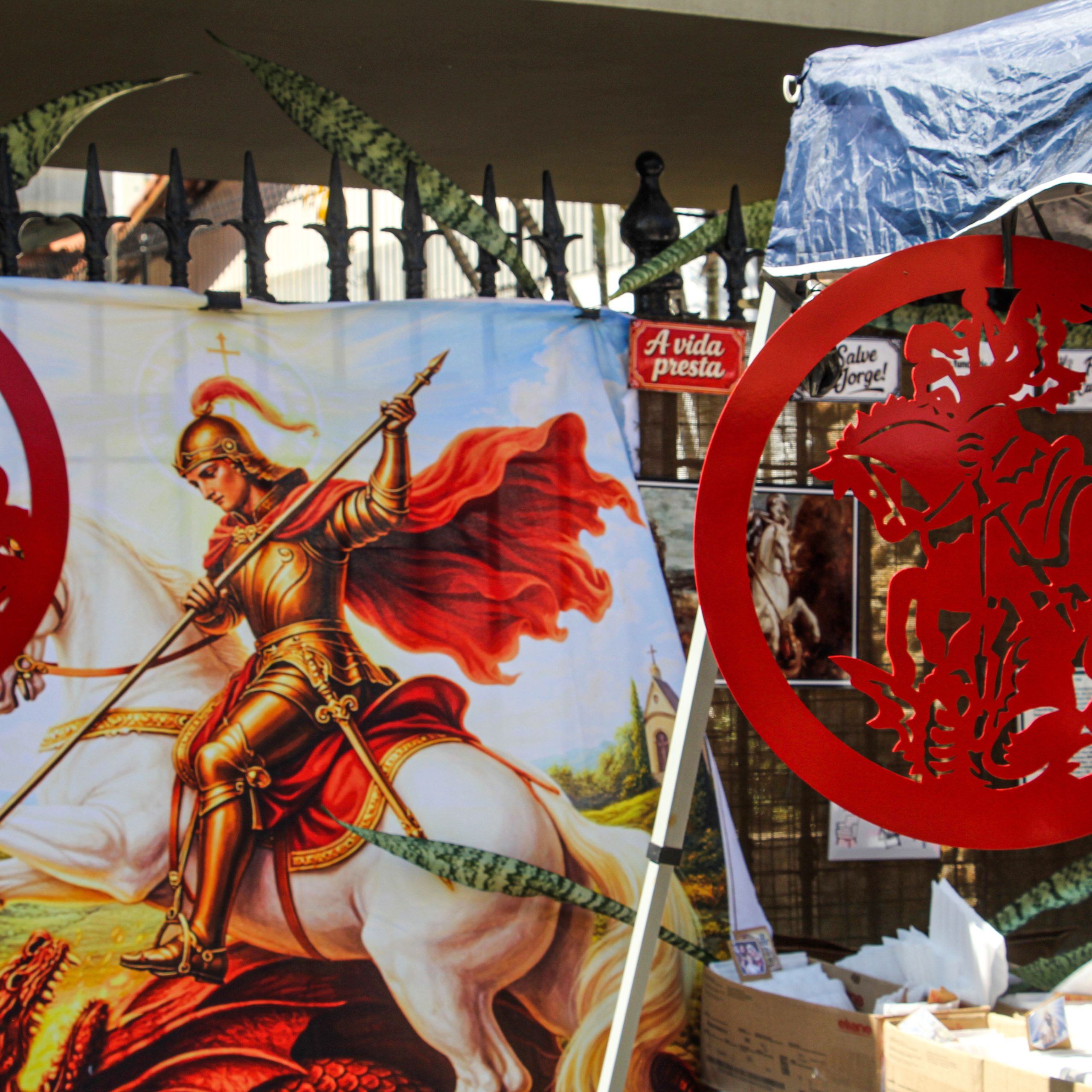 Além da participação religiosa, a celebração também é marcada por elementos culturais e comerciais. Barracas com comidas típicas, camisetas, rosas, velas e imagens do santo reforçam o caráter festivo da data. Popularmente conhecido como “santo guerreiro”, São Jorge é uma figura simbólica de coragem e resistência, reverenciada como protetor contra dificuldades e adversidades. Sua história remonta ao século III, quando seu exemplo de fidelidade e bravura o transformou em símbolo de luta contra o mal, frequentemente representado pelo combate ao dragão.