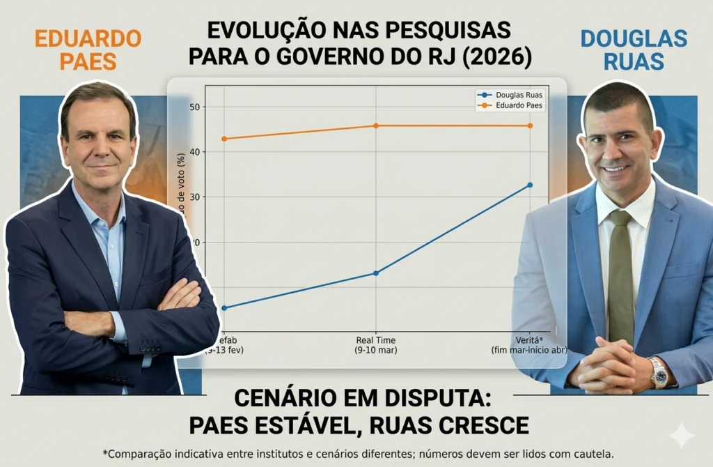 Agora, em abril, um levantamento divulgado com números atribuídos ao Instituto Veritá apontou Eduardo Paes com 46% e Douglas Ruas com 32,7%. O dado exige cautela técnica, porque compara institutos diferentes, com metodologias e recortes distintos. Ainda assim, a tendência política é inegável: Douglas Ruas cresceu, reduziu a diferença e passou a representar ameaça real à zona de conforto de Paes.