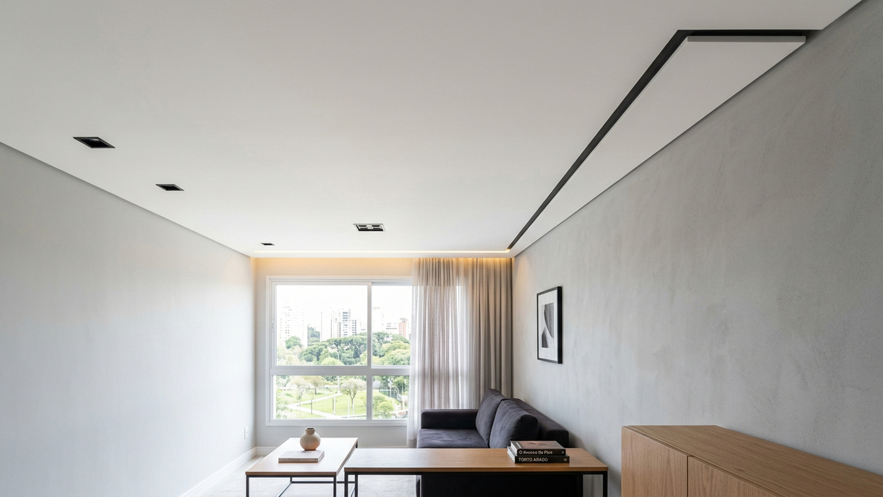Um detalhe comum em projetos de interiores é a presença de uma pequena folga entre o forro de gesso e as paredes, prática que desempenha papel importante na durabilidade do acabamento e na prevenção de fissuras. Essa separação, embora discreta, é funcional tanto para a manutenção quanto para a longevidade do teto.
