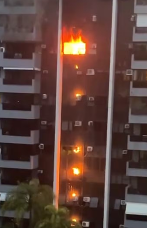 Imagens compartilhadas nas redes sociais mostram um foco de fogo intenso em uma janela do décimo andar do prédio. Além do incêndio na fachada, aparelhos de ar-condicionado de pelo menos sete apartamentos nos andares inferiores também foram atingidos, indicando a propagação do fogo por diferentes setores da edificação.
