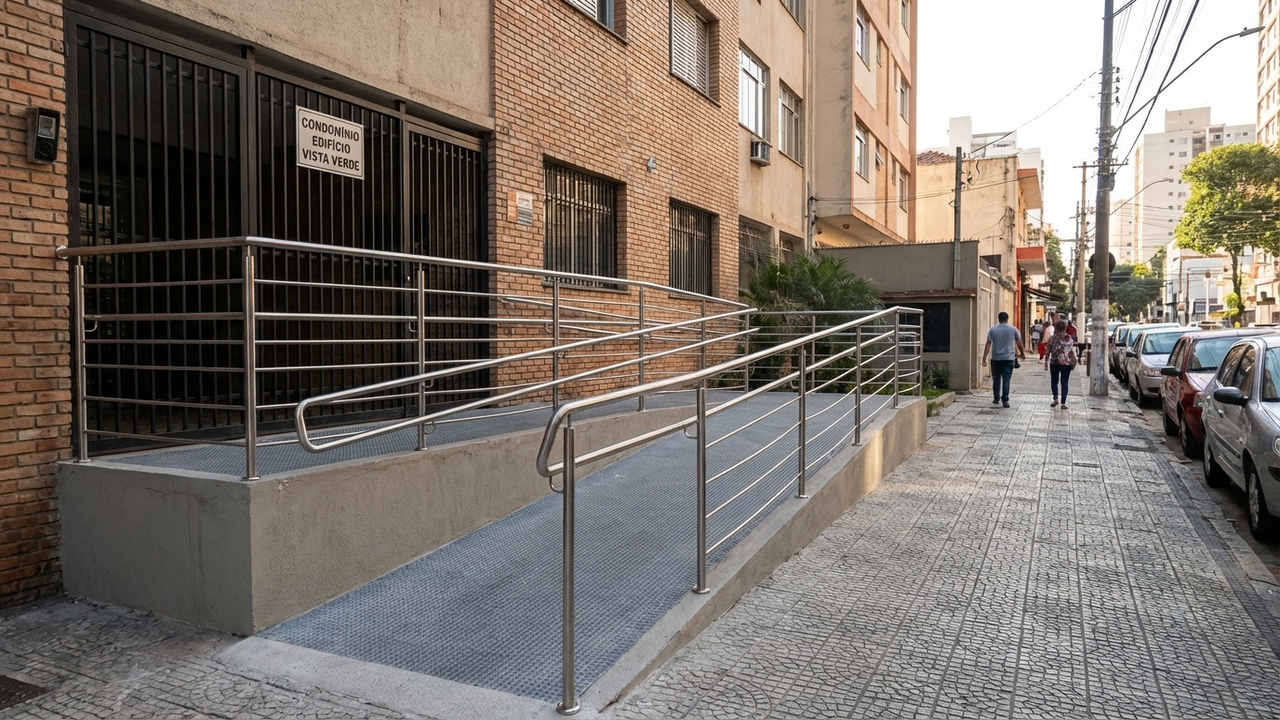 O conjunto de reformas obrigatórias inclui a instalação de rampas acessíveis com inclinação adequada e corrimãos duplos, além de elevadores com avisos sonoros e painéis táteis. Também devem ser adotados pisos antiderrapantes em áreas de circulação e rotas de fuga, além do alargamento de portas para permitir passagem de cadeiras de rodas. Essas intervenções precisam seguir normas técnicas da ABNT, garantindo a funcionalidade e segurança das adaptações.