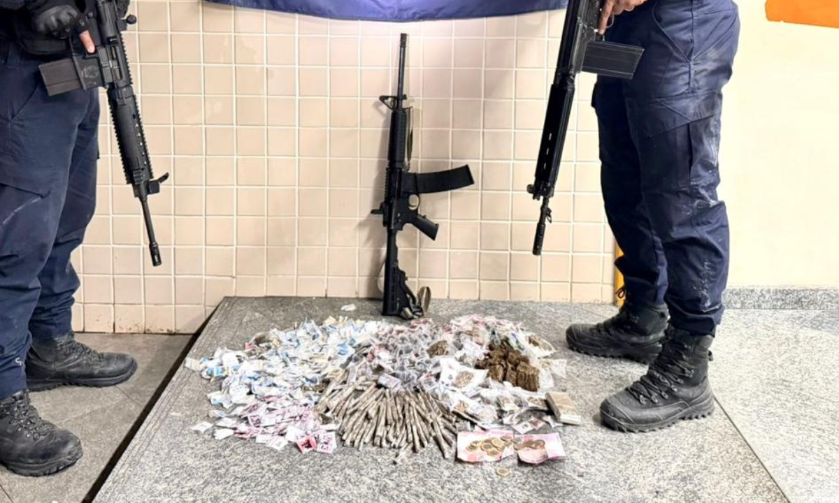 Nas proximidades do local da abordagem, os policiais encontraram uma mochila contendo uma quantidade significativa de drogas ainda em estágio de contagem, além do fuzil com uma numeração ilegível, o que impossibilita determinar sua origem. Também foi apreendido um radiotransmissor, equipamento usado para comunicação entre criminosos.