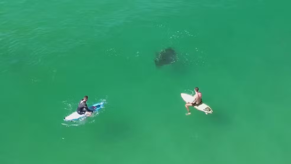 Uma grande raia foi observada nadando próximo à superfície do mar na altura da Praia da Macumba, no Recreio dos Bandeirantes. O animal percorreu a área entre os surfistas presentes, chamando a atenção por sua proximidade com os banhistas na água.