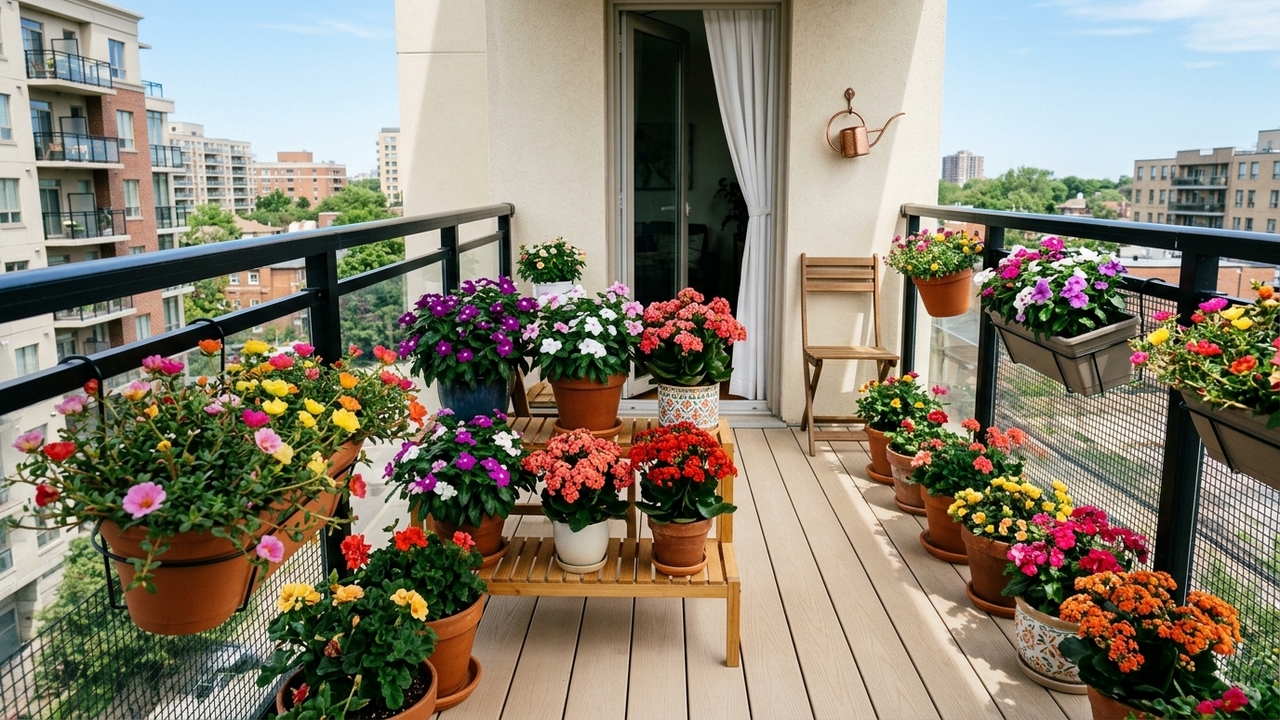 Verandas de apartamentos frequentemente buscam manter um visual harmonioso, colorido e bem cuidado, com atenção especial à limpeza do piso. Espaços compactos demandam escolhas cuidadosas de vasos e plantas, visando reduzir a queda de folhas e pétalas que possam sujar o ambiente. Plantas de crescimento rápido e com baixa dispersão de material vegetal são opções vantajosas para facilitar a manutenção diária e garantir uma aparência organizada.